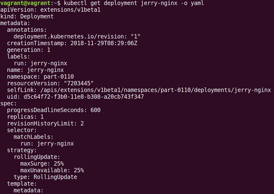 apiVersion: extensions/v1beta1 kind: Deployment metadata: annotations: deployment.kubernetes.io/revision: "1" creationTimestamp: 2018-11-29T08:29:06Z generation: 1 labels: run: jerry-nginx name: jerry-nginx namespace: part-0110 resourceVersion: "7203445" selfLink: /apis/extensions/v1beta1/namespaces/part-0110/deployments/jerry-nginx uid: d5c64f72-f3b0-11e8-b308-a20cb743f347 spec: progressDeadlineSeconds: 600 replicas: 1 revisionHistoryLimit: 2 selector: matchLabels: run: jerry-nginx strategy: rollingUpdate: maxSurge: 25% maxUnavailable: 25% type: RollingUpdate template: metadata: creationTimestamp: null labels: run: jerry-nginx spec: containers: - image: nginx:1.12.2 imagePullPolicy: IfNotPresent name: jerry-nginx resources: {} terminationMessagePath: /dev/termination-log terminationMessagePolicy: File dnsPolicy: ClusterFirst restartPolicy: Always schedulerName: default-scheduler securityContext: {} terminationGracePeriodSeconds: 30 status: availableReplicas: 1 conditions: