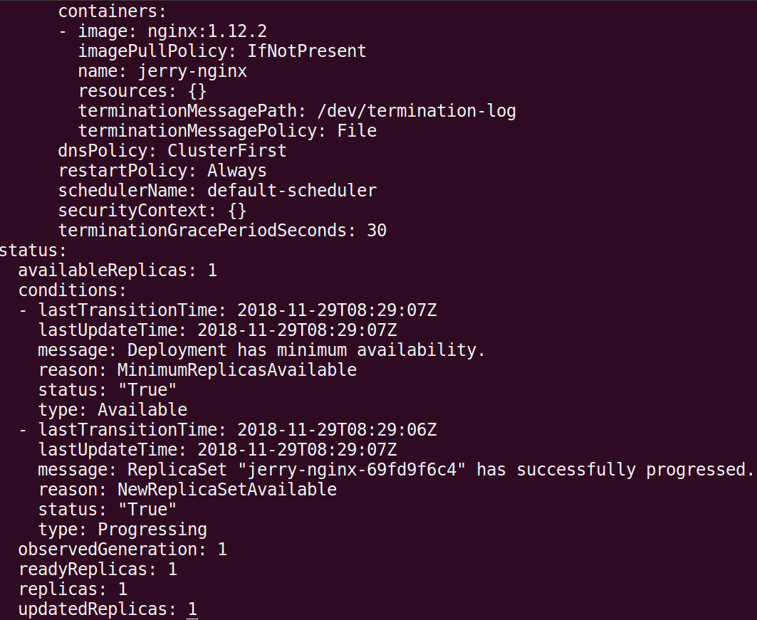 - lastTransitionTime: 2018-11-29T08:29:07Z lastUpdateTime: 2018-11-29T08:29:07Z message: Deployment has minimum availability. reason: MinimumReplicasAvailable status: "True" type: Available