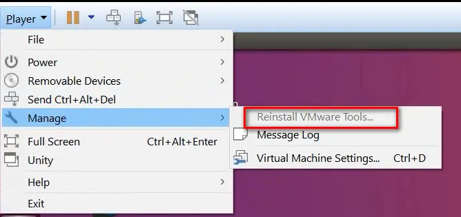 - 使用VMware启动虚拟机,菜单Player->Manage->install VMware Tools. 因为我已经安装过了,所以菜单变为灰色。
