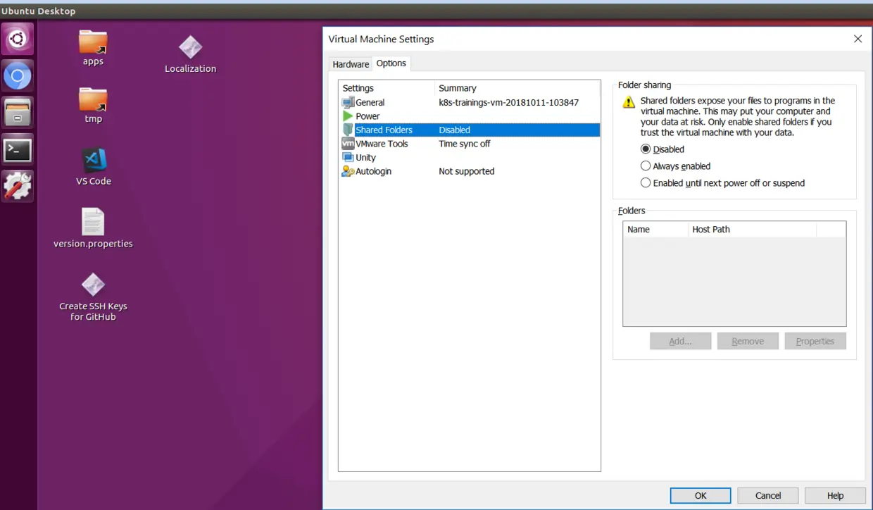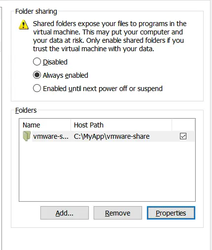 - Virtual Machine Settings->Share Folders, 将Disabled改为Always enabled: