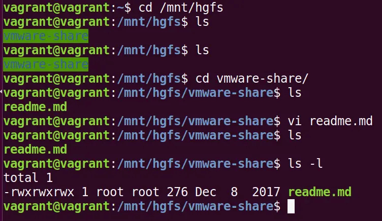 这个文件夹就立即出现在Ubuntu虚拟机里的目录: /mnt/hgfs: