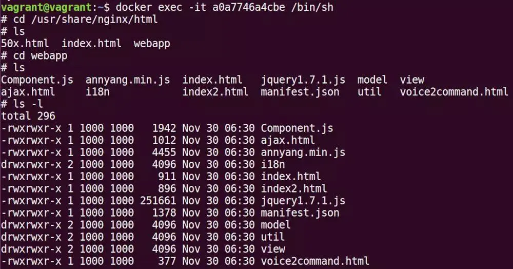 再次执行docker exec进入docker容器内部,确保**/usr/share/nginx/html**文件夹下确实包含了期望看到的UI5应用。