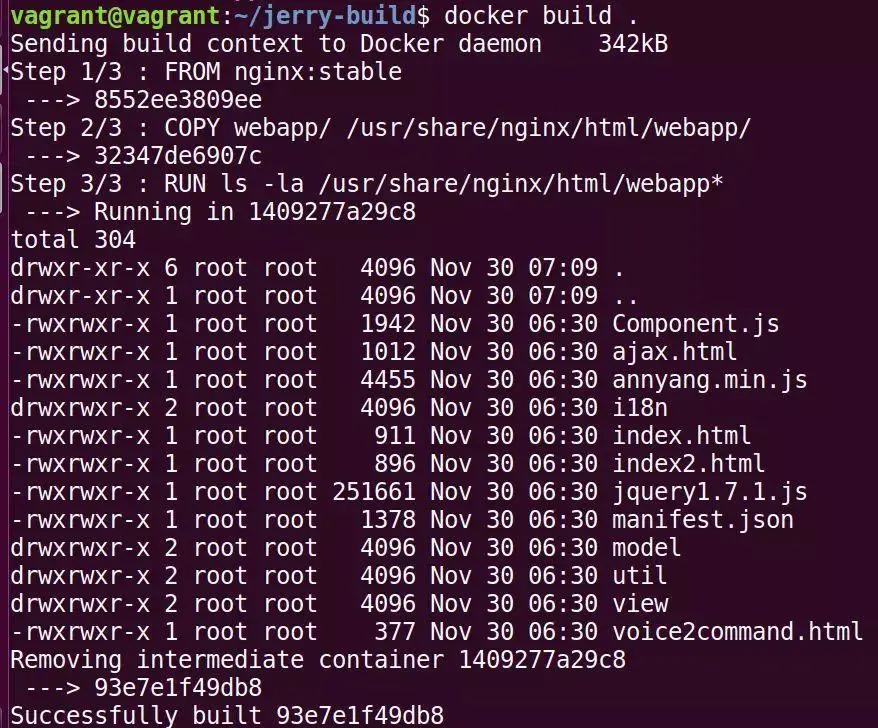 这三个指令从语义上不难理解,第一行FROM命令告诉docker镜像构建例程使用nginx的stable版本作为基础镜像进行新镜像的构建。第二行COPY命令负责把webapp文件夹下的所有UI5资源文件拷贝到nginx docker镜像的对应目录内。第三行RUN命名执行shell命令ls,生成新的镜像文件。