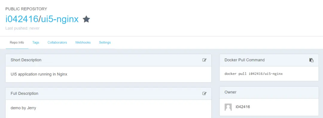 到目前为止这个本地docker实例是没有办法给其他人使用的,为此我们得先利用dockerfile制作一个包含了UI5应用的docker镜像,上传到docker hub上,以便其他人下载。