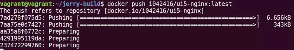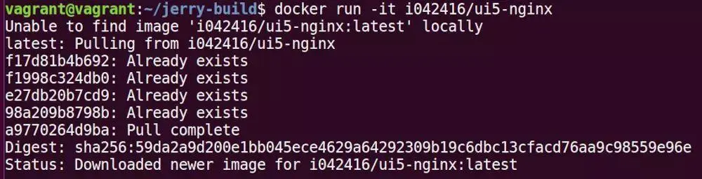 在两种情况下,由于本地镜像检索失败,我们都将看到提示信息:Unable to find image ‘i042416/ui5-nginx:latest' locally, 然后观察到远端镜像的下载过程。