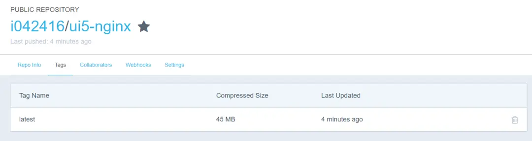 刷新Docker hub上新建的仓库,能观察到刚才的本地推送记录和镜像尺寸。