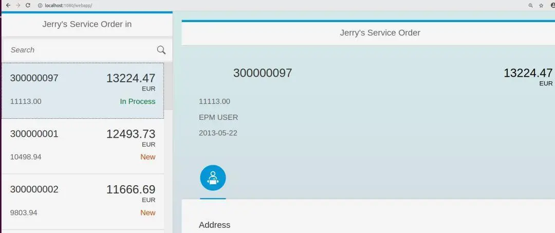 我用来部署的UI5应用名叫Jerry's Service Order, 是一个典型的Master-Detail风格的应用,左边Master List是所有服务订单列表,选中任意一个,在右边的Detail页面显示选中的服务订单的明细。
