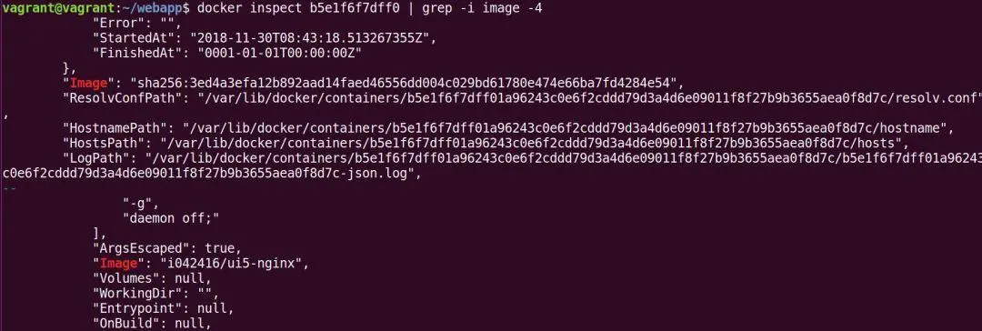 docker inspect命令证实了这个启动的容器确实是基于镜像i042416/ui5-nginx的。