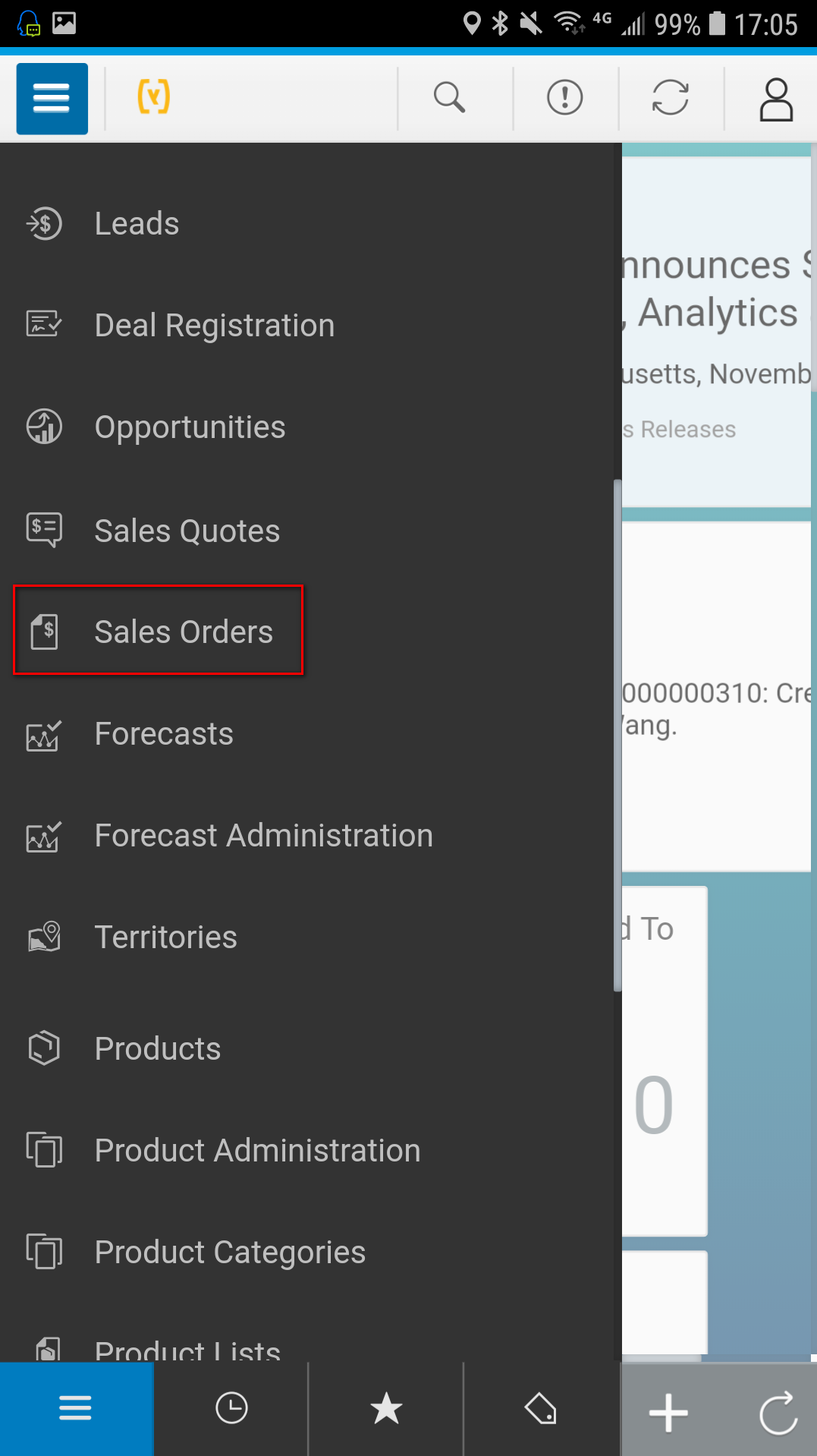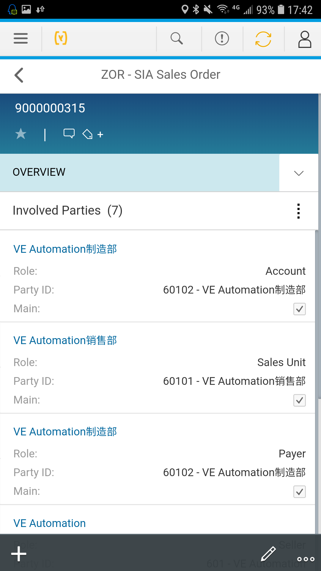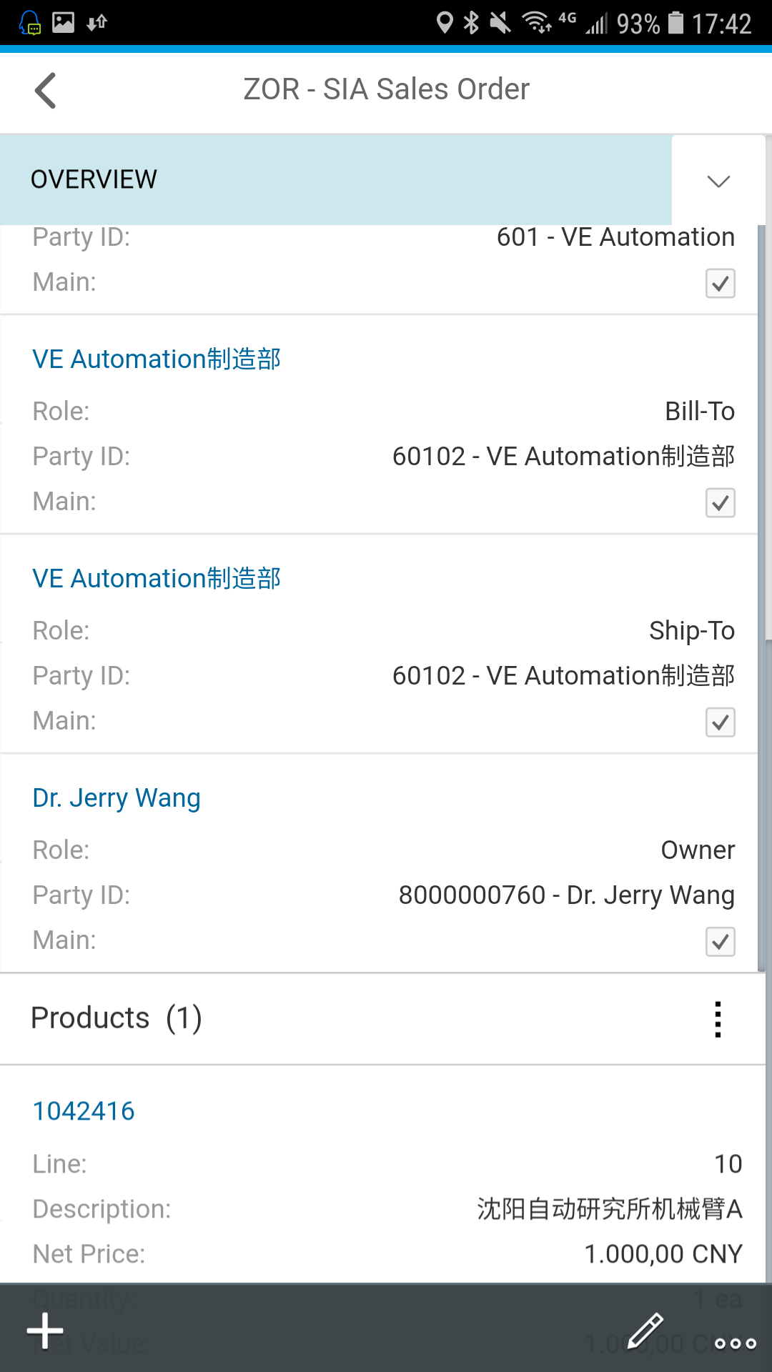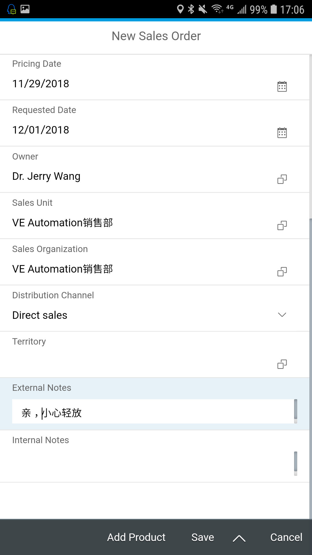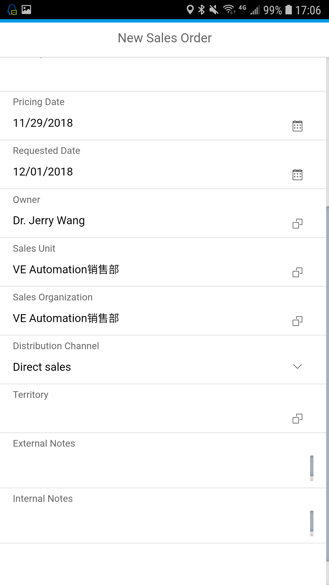 如果C4C系统里选中的Account事先维护好了Partner determination配置的话,对应的Sales Unit和Sales Organization,Distribution Channel等字段会自动带出来: