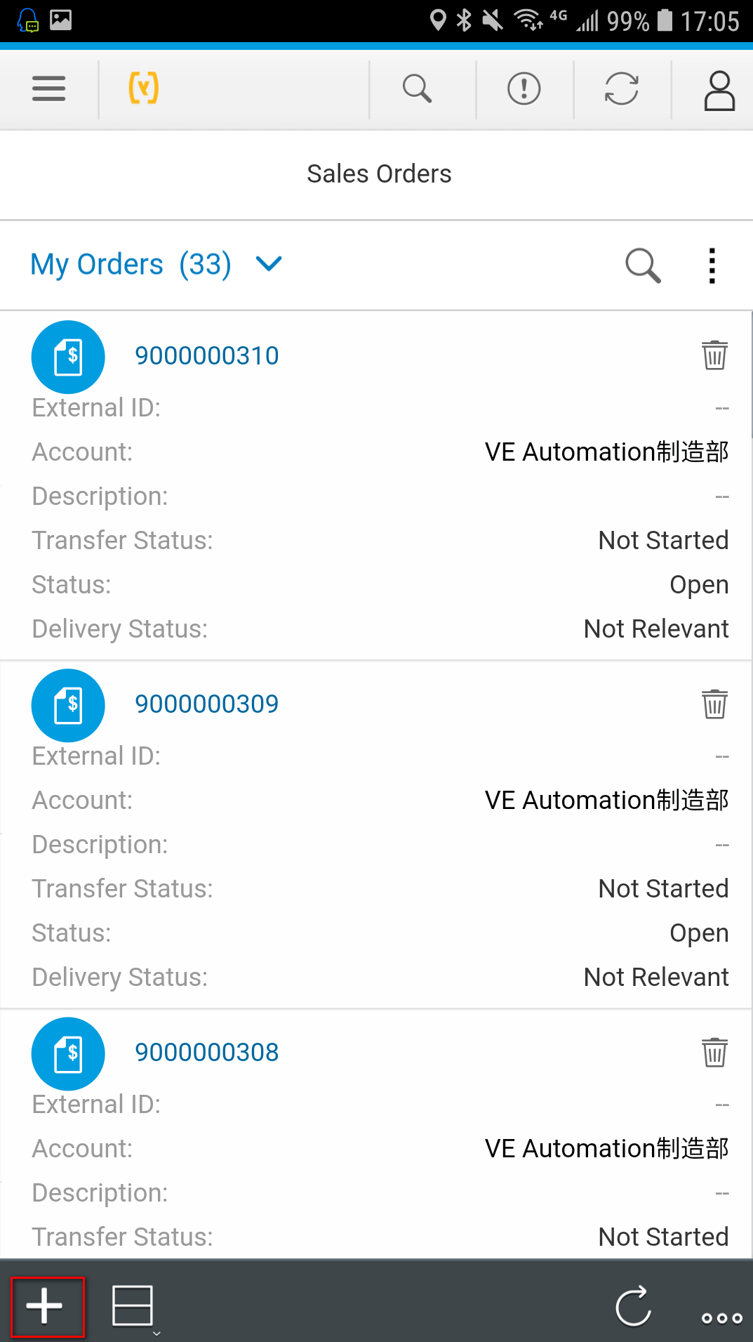可以看到系统里很多已有的销售订单了。点击屏幕左下角的创建按钮: