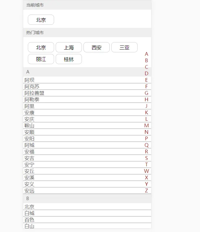 elment=this.$refs['Z'][0] 或者 elment=this.$refs['B'][0] 来获得我们要跳转的某一个字母的城市区域, 这样就可以点击字母滑动到指定位置.