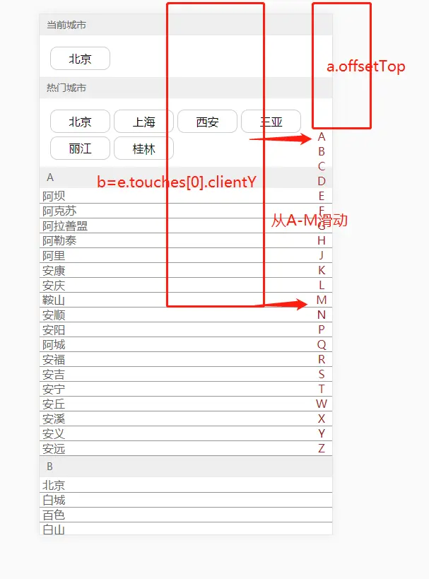 updated () { //获取A点距离最外层 (此时是#APP)的offsetTop值 this.startY=this.$refs["A"][0].offsetTop +66 }, methods:{ handleClick(e){ this.$emit("change",e.target.innerText) }, handleTocuchStart () { this.touchStatus=true; }, handleTocuchMove (e) { if(this.touchStatus) { if(this.tiemr) { clearTimeout(this.tiemr) } /**函数节流 */ this.tiemr=setTimeout(() => { //此时是获取手指移动结束后,到达顶部的高度 const touchY=e.touches[0].clientY; //向下取整,利用高度差除以每一个字母的高度来算出字母的下标 const index=Math.floor((touchY-this.startY)/21); if(index>=0&&index<this.letters.length){ this.$emit("change",this.letters[index]) } }, 16); } },最后获得字母之后根据scrollToElemem.来滑动到相应的城市.