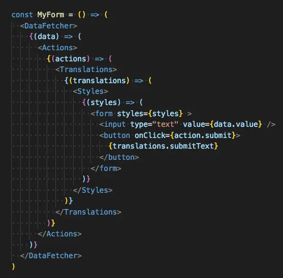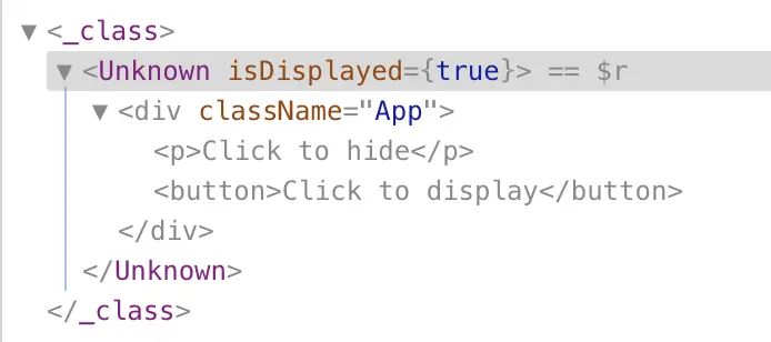 const Wrapper = WrappedComponent => class extends React.Component{ constructor(props) { super(props); this.state = { isDisplayed: defaultTo(props.initialState, false), }; this.hide = this.hide.bind(this); this.show = this.show.bind(this); } hide() { this.setState({isDisplayed: false,}); } show() { this.setState({isDisplayed: true,}); } render(){ const newProps = { ...this.props, ...this.state, hide: this.hide, show: this.show }; return <WrappedComponent {...newProps}/> } }; const App = Wrapper(({isDisplayed, hide, show}) => { return ( <div className="App"> { isDisplayed && <p onClick={hide}>Click to hide</p> } <button onClick={show}>Click to display</button> </div> ); })- render props