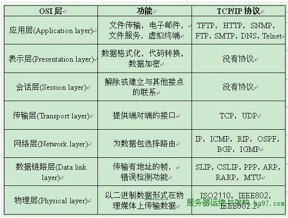 各层的作用及描述,以及对应的协议如下图(好东西啊,不过本文图是盗图,懒得重画了,仅供各位学习使用):