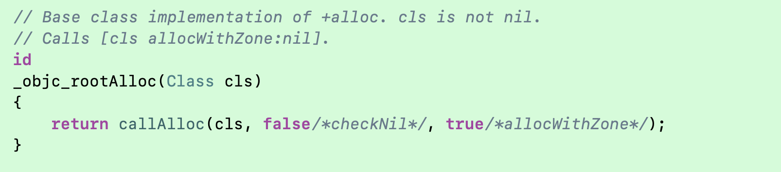 instanceSize()方法分配内存,calloc()开辟空间,initInstanceIsa()创建对象。并且进入