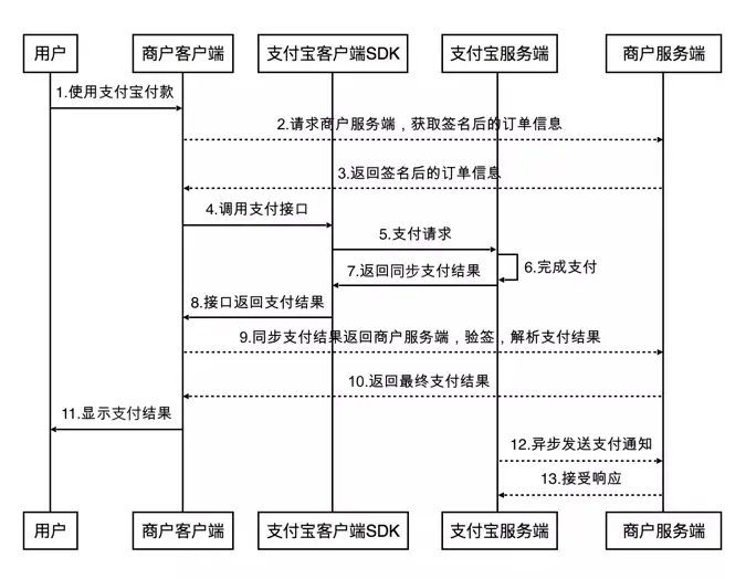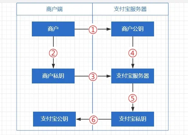 ①:商户上传自己的商户公钥到支付宝服务器 ②:使用商户私钥请求签名参数 ③:签名以后的参数请求到支付宝 ④:支付宝服务器使用商户上传的商户公钥,验签商户请求参数,并处理支付结果 ⑤:对商户支付结果使用支付宝私钥签名 ⑥:商户使用支付宝公钥验签支付返回的支付结果