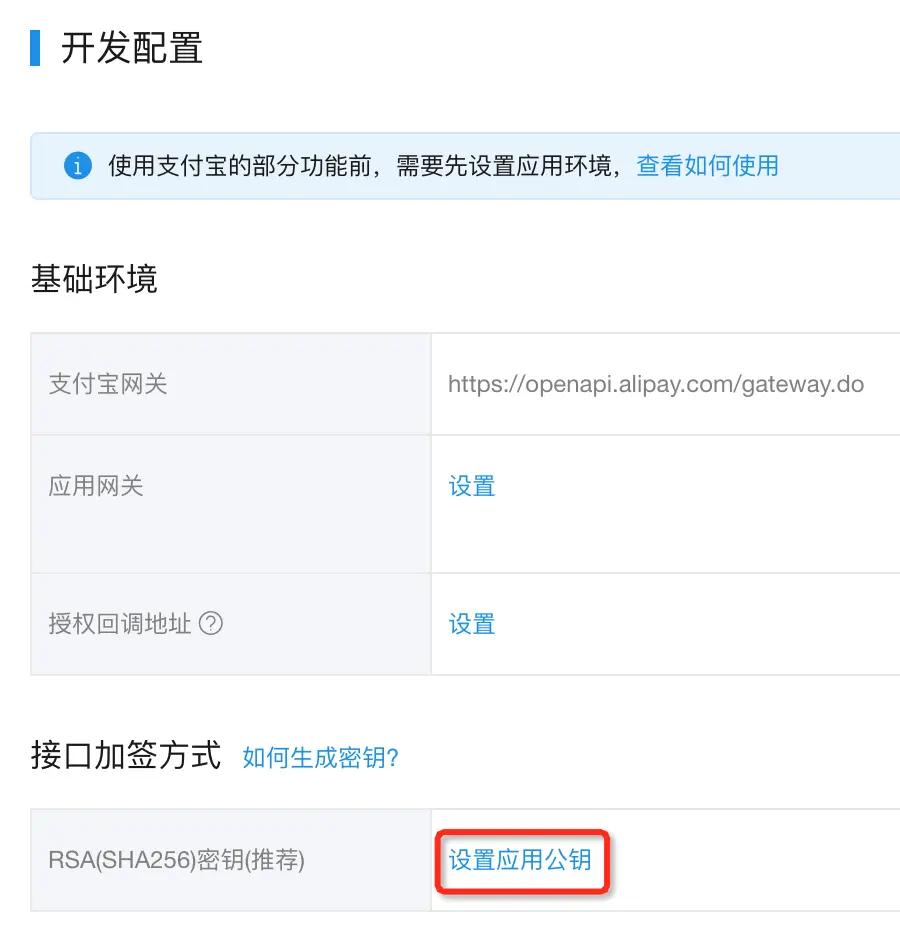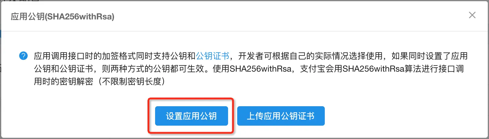 根据开发者的条件设置应用公钥或上传公钥证书,常规请点击设置应用公钥。