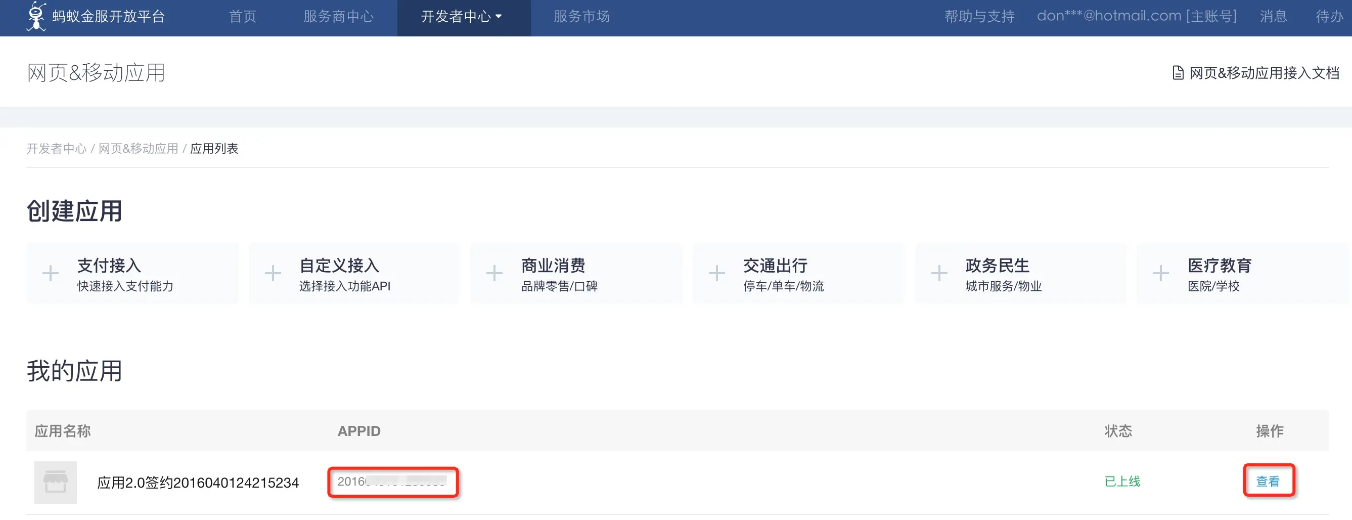 在“我的应用”中,选择要配置密钥的应用,点击“查看”。记录对应的APPID(下图红框处),在代码中使用。