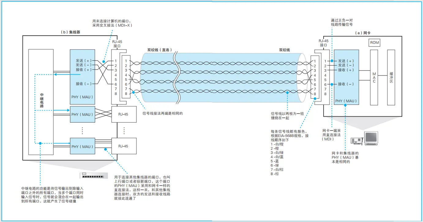 - 下面这幅图的信号流动是从右向左,信号是从网卡流动到集线器。