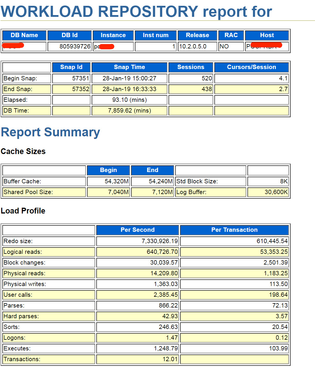 AWR报告开始生成不出来,一些常规操作后,拿到了故障时间段的AWR报告。先看下大概的信息,采样的一个半小时内数据库AAS(平均活跃会话数)已达84,redo量比较大,硬解析、登录、排序等指标没严重的问题。