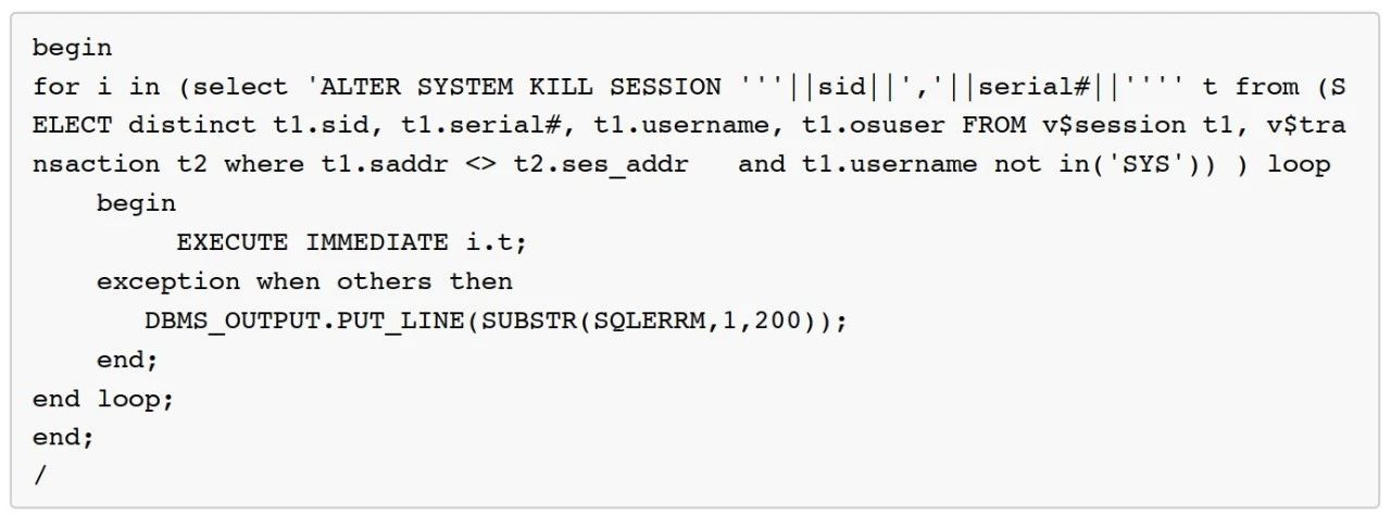 刚准备上机操作,发现数据库主机又开始又登录不进去了,客户DBA尝试了几分钟后,终于登录进去,一查果然CPU 100%了,为了应急保证业务,临时决定先杀一批没有事务的会话。