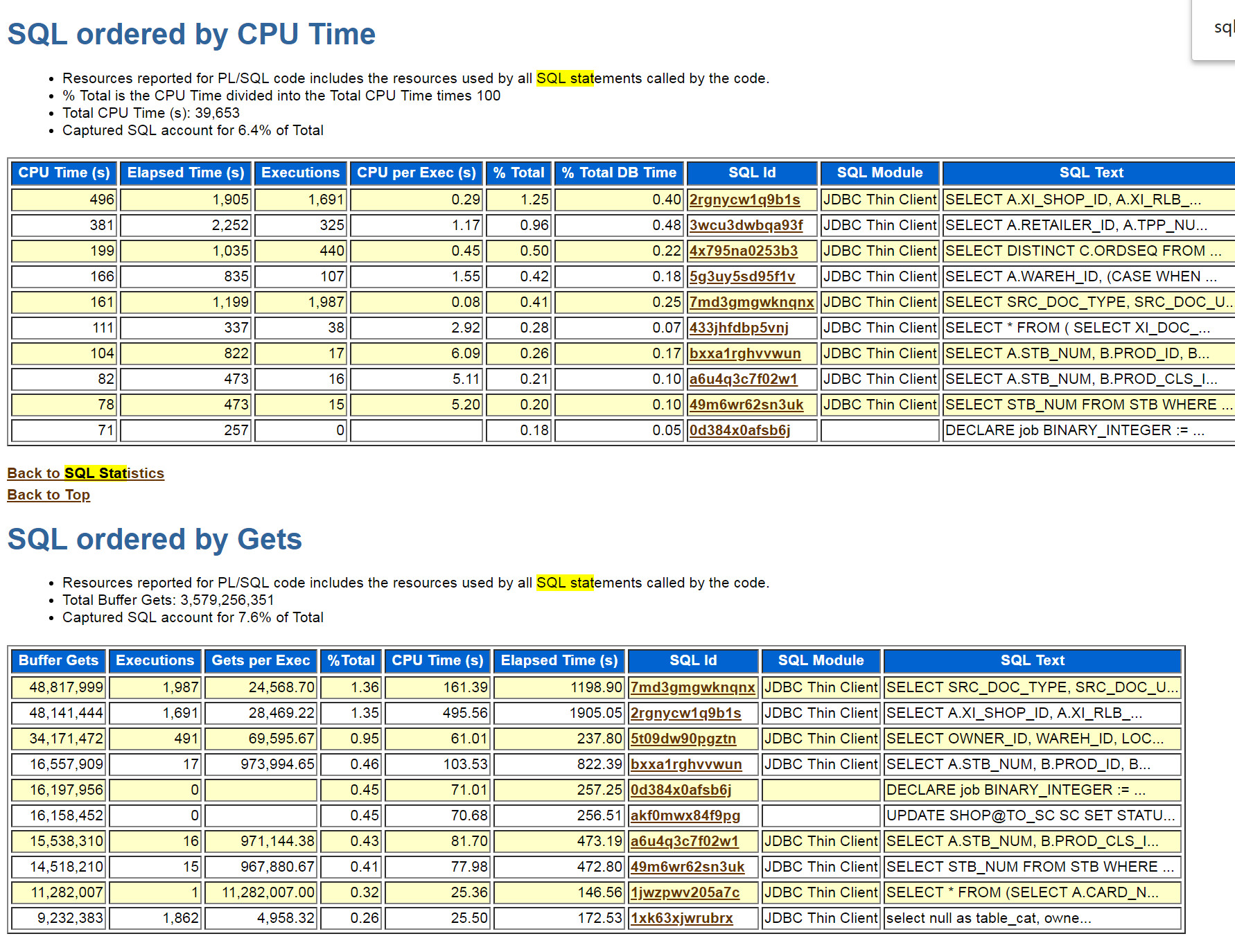 其实大部分情况到这步了很多DBA基本上就直接搜索`SQL ordered by CPU Time`或是`SQL ordered by Gets`去定位TOPSQL了。
