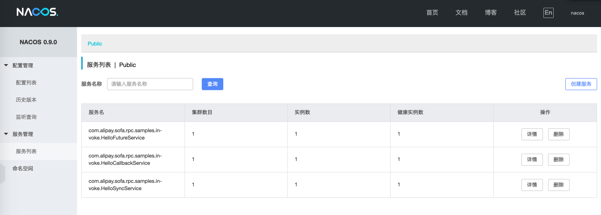 run com.alipay.sofa.rpc.samples.invoke.InvokeServerApplication启动成功后即可在 Nacos 服务端看到服务注册信息:Nacos 服务列表 (注:如果用户自己部署了nacos的服务端,可以通过这个地址访问)