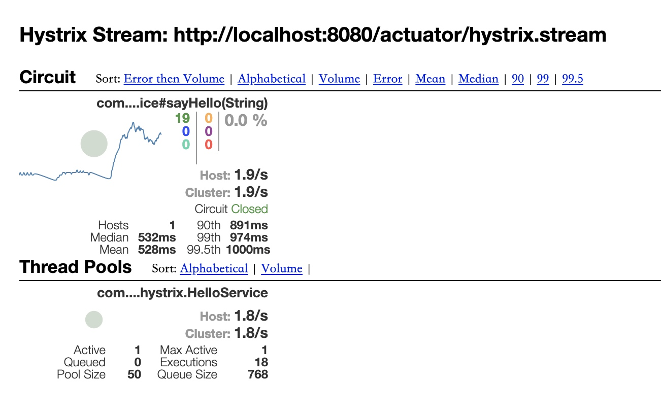 此外如果项目中使用了 Spring Boot Actuator,Hystrix 就可以通过 Actuator 内置的 /metrics Endpoint 暴露出 RPC 调用的相关指标,包括请求数、成功率和延时等信息,可以非常方便的集成于现有的监控系统中。