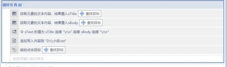 6、最后,最重要的一步来了,前面我们只是获取到当前这一章的内容,我们想要获取整本小说,拿就得用循环命令,再配合上点击下一章的操作,这样就能实现循环的把每一章内容都提取出来,最终就能把整本小说都扒下来了。