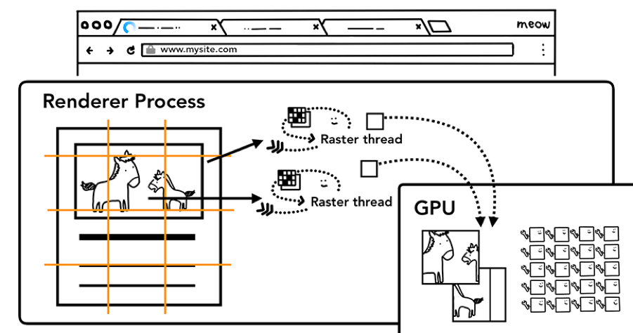 一旦创建了层树并确定了绘制顺序,主线程就会将该信息提交给compositor(合成器)线程。 compositor线程随后栅格化各层。 一个图层可能像页面的整个长度一样大,因此合成器线程将它们分成多个图块并将每个图块发送到光栅线程。 栅格线程栅格化每个图块并将它们存储在GPU内存中。
