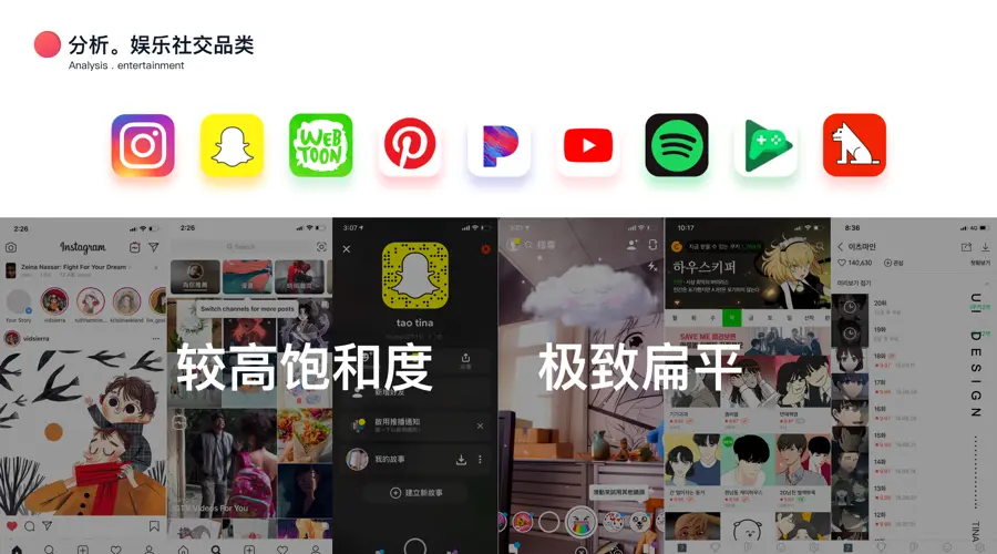 分析了美国排名靠前的娱乐社交类app,大多数的icon都使用了较高饱和度的色彩;UI界面的主色调也基本继承了icon的颜色,设计风格极度扁平, age to age;如下图: