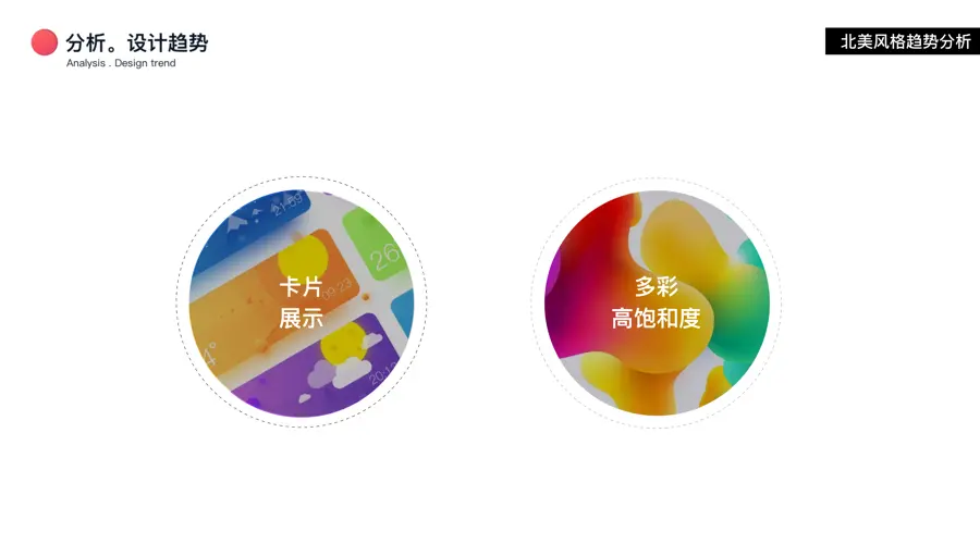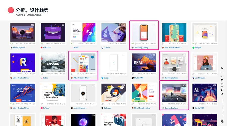 从各大设计网站截图可以很容易的看出,有以下几个共性:多彩,高饱和度,卡片化的展示,细腻的微交互,如下图: