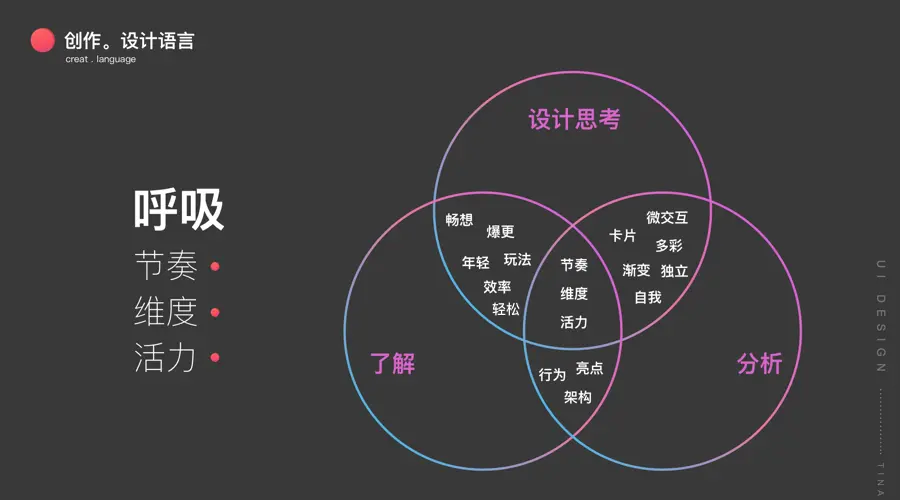 到这个环节之后,就需要把前面获取到的信息揉在一起去考虑,我一般会列举所有的关键词,并且把他们重新组合,找出共性,提炼出来一个主旨,也就是属于这个项目独有的设计语言。我得出的设计语言是:呼吸。