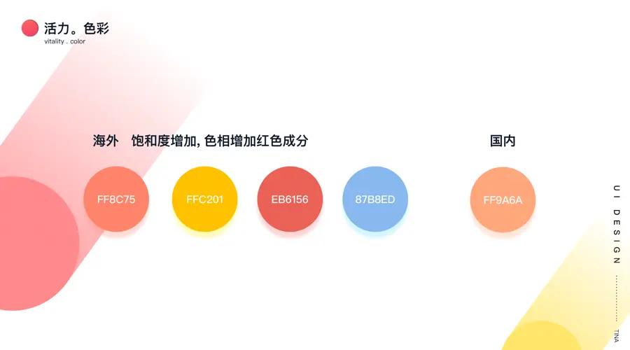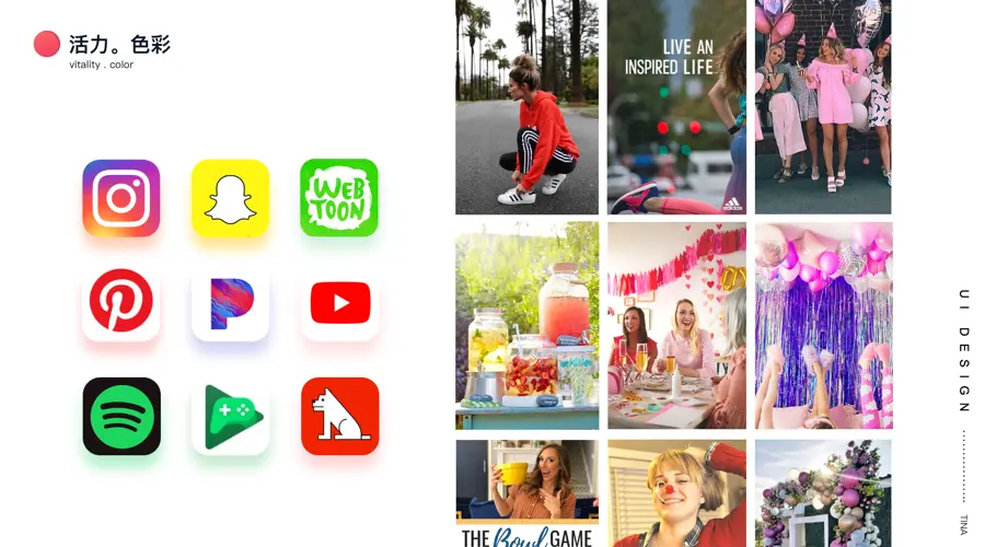 综合了美国Ios和安卓常用社交娱乐app,以及美国女性经常出现的场景图片,分析了它们的颜色,并做了分类,发现较多的使用了较高饱和度的色彩,所以在此次海外版本上,把国内版本的主色调进行了细微的调整。增加饱和度,色相也更暖,看起来更有活力,如下图是本次海外版本的用色。