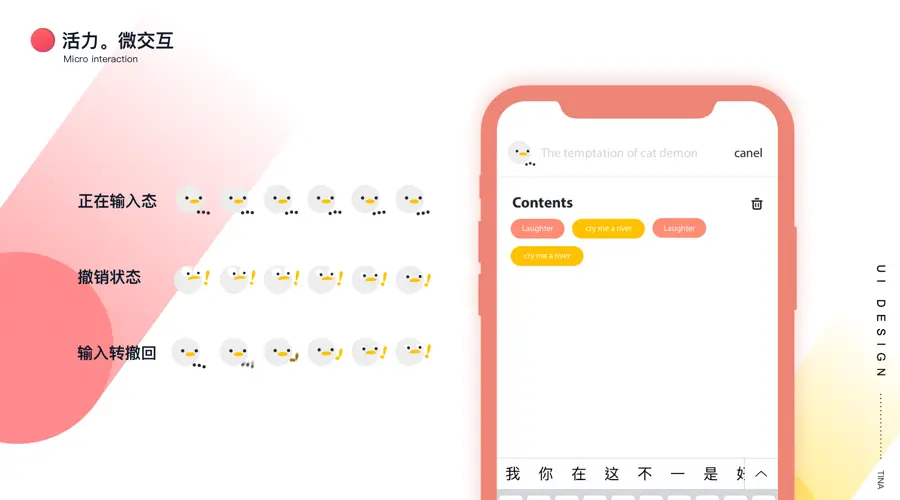 下面列举微交互的一个案例。在搜索操作中,我尝试把不同输入状态与不同的表情关联起来,让用户在操作的同时。能够得到及时有趣味性的视觉反馈;如下图