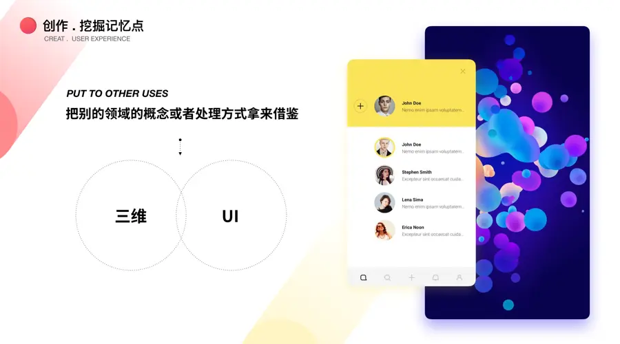 这是奔驰法有7个切入点,我此处是用了第五点:“put to other uses”;可以理解为设计时把别的领域的概念或处理方式拿来借鉴,我觉得可以理解为改变用途。其实拟物化就是用作他用的典型代表。它是在UI层面模拟实物的形态材质,从交互层面模拟实物的物理特性,最终运用在图标界面设计、动效设计等方面。