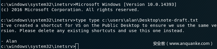 在获取一个低权限的shell以后,我们能在c:usersalanDesktop路径下拿到下一步的线索。他告诉我们,在Public Desktop路径中存在一个VS的快捷方式,让我们利用它。