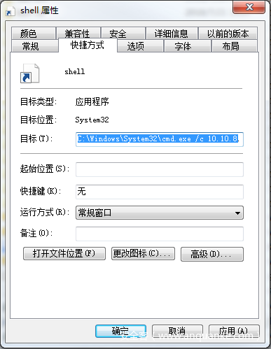 生成后的恶意快捷方式如下,你可以看到需要执行的命令在快捷方式目标栏处。