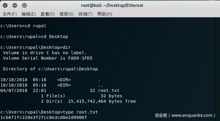 将签名后的msi上传至d:devmsisshell.msi,然后退出73和136的两个openssl连接,重新监听它们,大约1分钟的时间,rupal用户的shell就会上线,可以在他的Desktop路径下读取root.txt