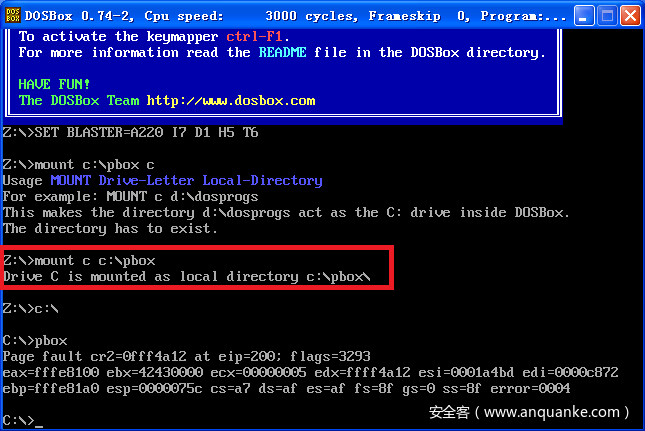 16位程序模拟器很好找,DosBox是目前最有名的一款,很多当年的街机游戏都可以运行,像是波斯王子、坦克大战啊,这些我都还没通关…进入pbox首先执行挂载mount c c:pbox,将此c:pbox文件夹挂载为pbox的c盘,这样就可以在pbox中看到pbox.exe。但是直接运行还是会报错如下: