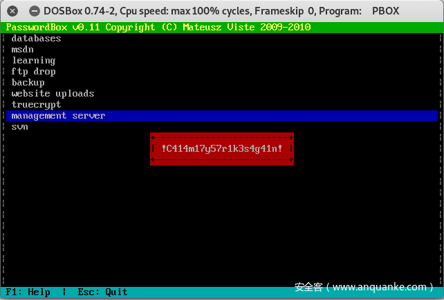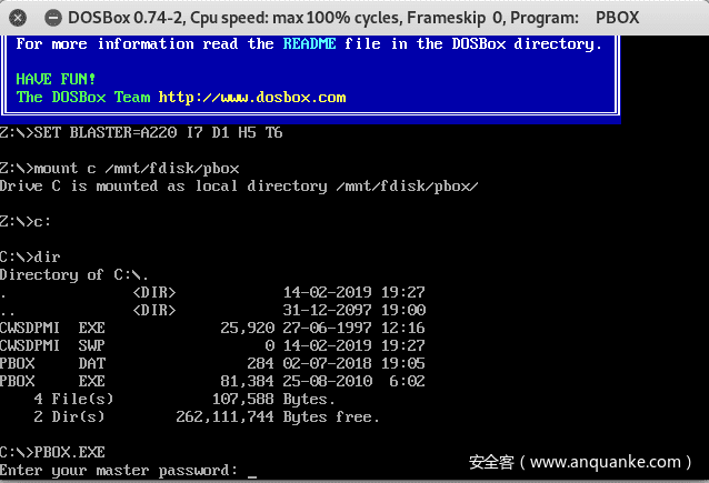这可能是版本兼容的问题,好在kali环境下也能安装DosBox(apt-get install dosbox),但因为Dos保护模式的原因,可能会报一个类似< no DPMI – Get csdpmi*b.zip > 的错误。解决方式可以参考:www.linuxtopia.org/online_book… 解决问题的核心关键就是下载CWSDPMI.EXE然后扔到pbox.exe目录下,就可以正常运行pbox.exe了。