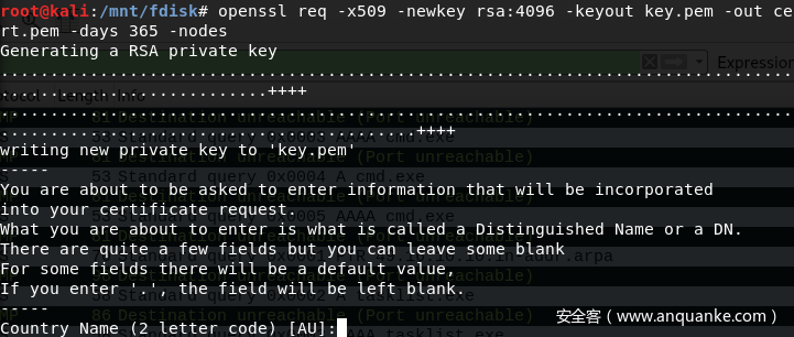 openssl服务器用于接收反弹shell。在kali端首先搭建openssl server你需要一个私钥和一本证书,因此运行命令: