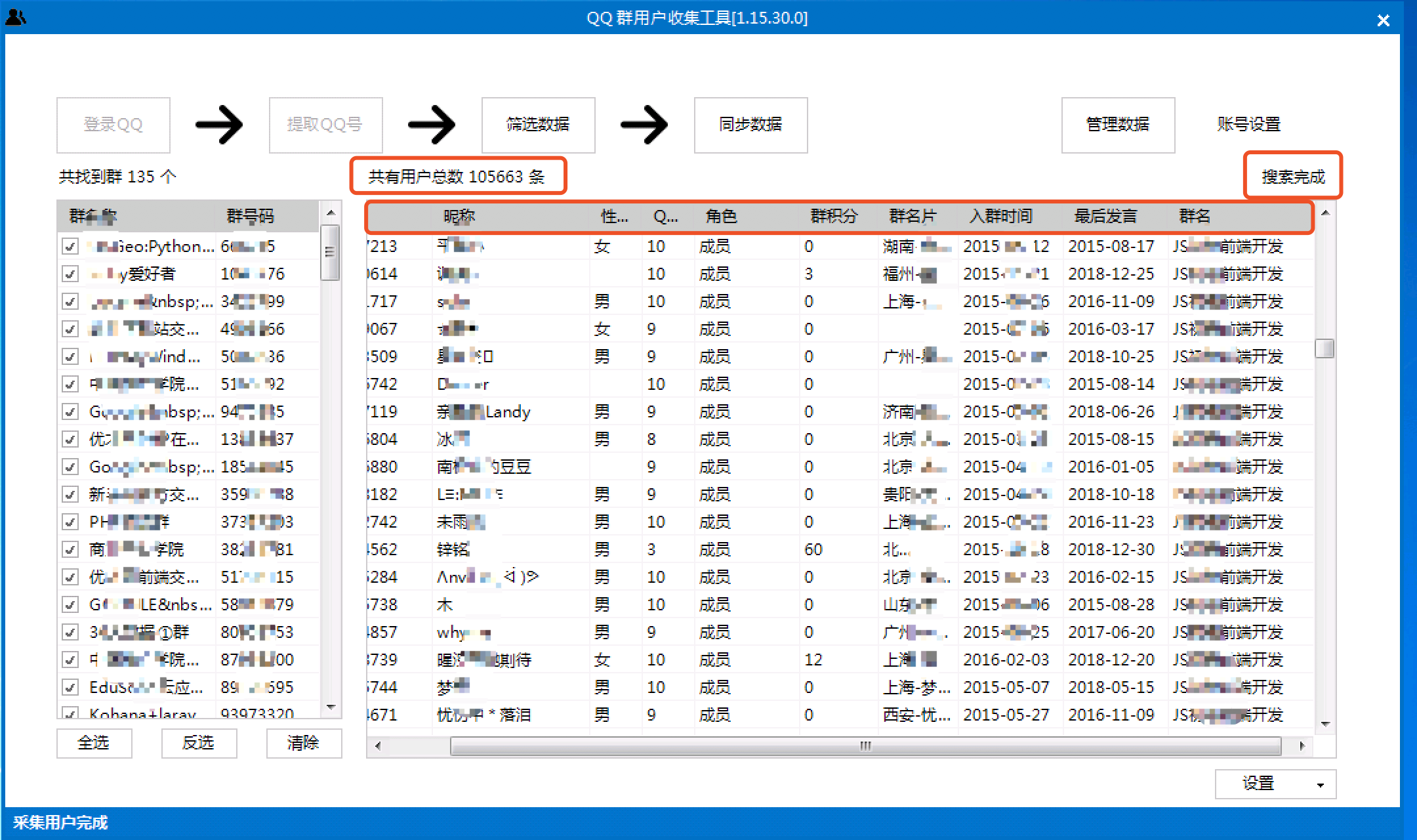软件自动过滤重复QQ,性别、入群时间、发言时间、积分、Q龄这些都能提取。