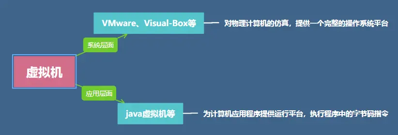 虚拟机,简单说就是一台虚拟的计算机。 虚拟机主要分为系统层面的和应用程序层面的。系统层面的虚拟机,比如我们常用的 VMware、Visual-Box等,利用它们可以完成对物理计算机的仿真,提供一个完整的操作系统平台。应用程序层面的虚拟机,比如 java虚拟机(JVM),它为计算机应用程序提供运行平台,执行程序中的字节码指令。