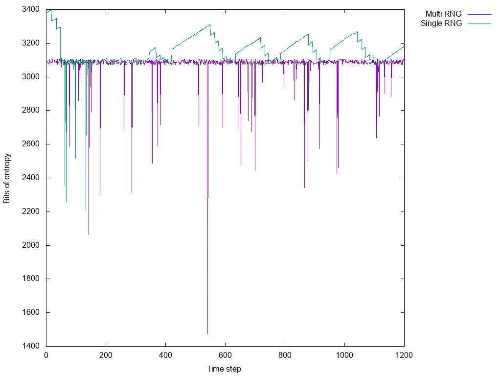 The data for this graph came from checking /proc/sys/kernel/random/entropy_avail every 0.1swhile the relevant code was running and then killed at two minutes. In purple you see the available entropy when running the old code and it’s just dips with one precipitously large dip. Given a longer runtime or a system with less activity those dips could hit zero and simply halt the system. In green the new code which has the same dips early on, but is otherwise much more well behaved.