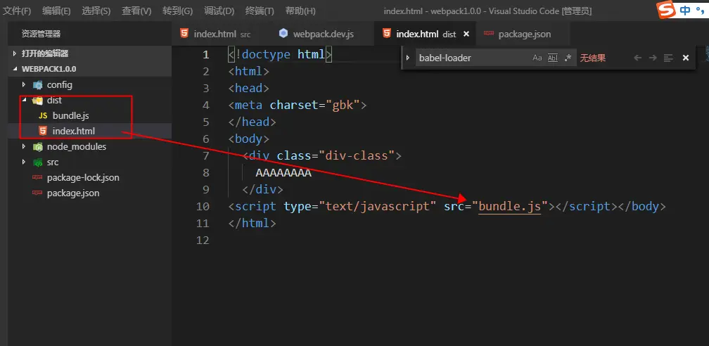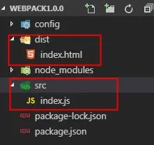 下面我们把上述 一 ~ 三节完成的项目里的项目内容进行下调整,我们把dist中文件清空,并在src文件夹中添加 index.html 模板HTML,完成后文件目录如图: