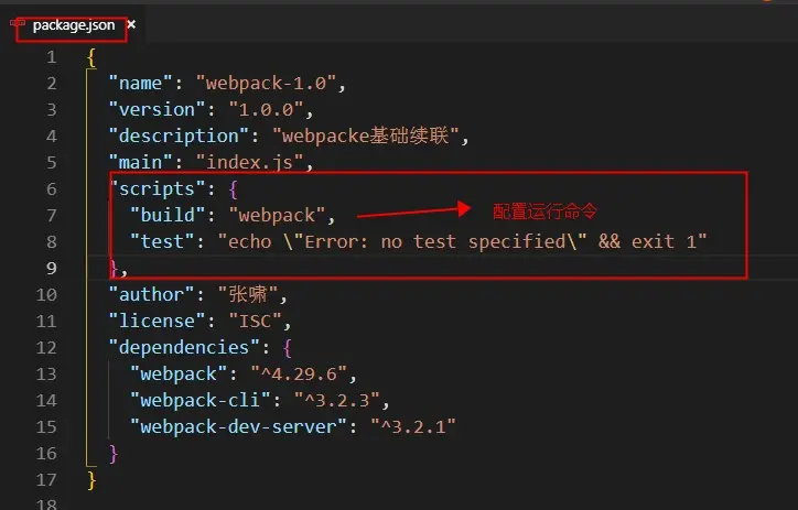 接下来,我们使用 npm install html-webpack-plugin 将项目中使用的未安装的包安装了。剩下的操作是我们重新配置下webpack打包的命令,第三节我们有介绍在package.json 文件中配置运行命令;下面我们贴出package.json代码: