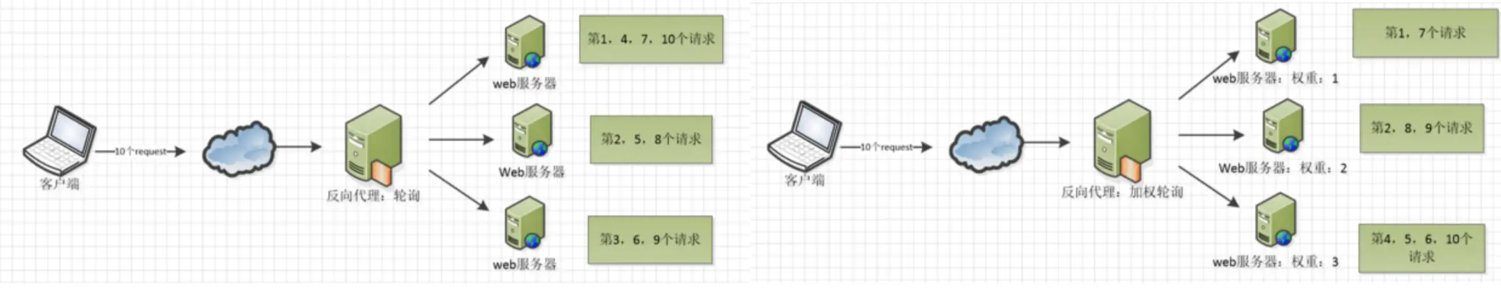 如下图,左侧为没有配置加权的轮询,右侧为配置了加权之后的轮询,会根据加权数去进行分配。